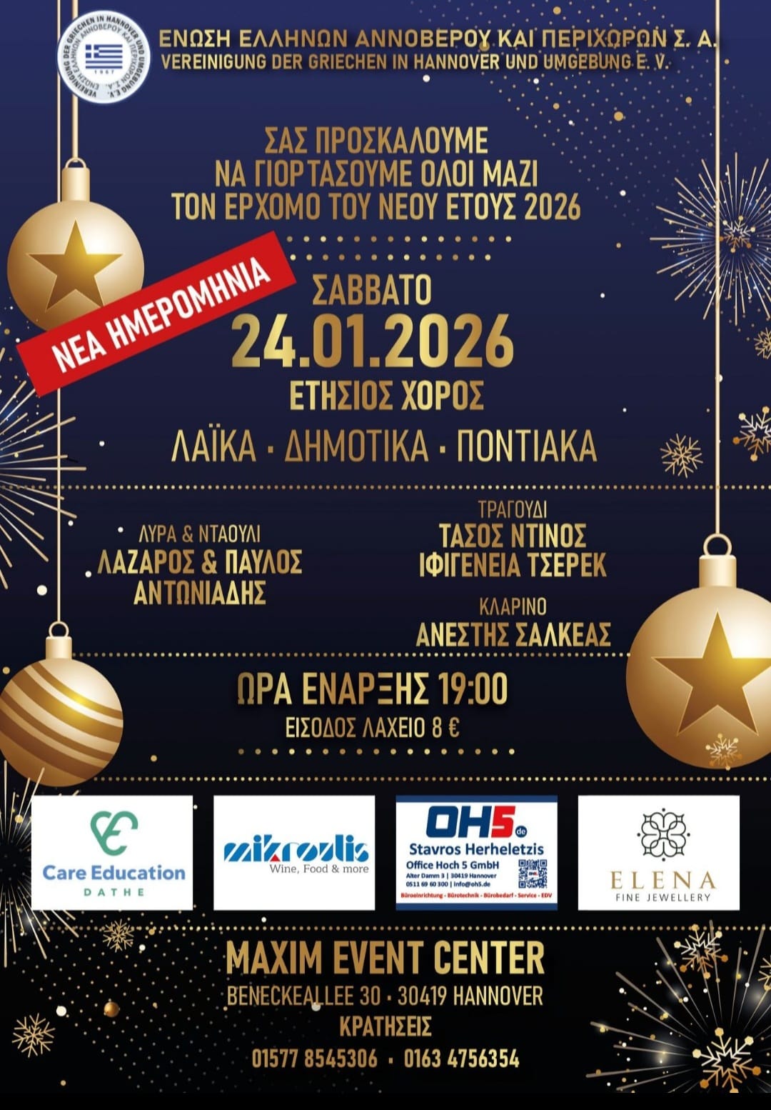 | Der SV Iraklis Hellas bedankt sich bei den Mitgliedern und Zuschauern für die Treue und Unterstützung im vergangenen Jahr. Ihnen und Ihren Angehörigen wünschen wi alles Gute im 2026. Bleiben Sie Gesund! Το Ελληνικό Αθλητικό Σωματείο Ηρακλής Ελλάς Αννοβέρου εκφράζει τις θερμές του ευχαριστίες στα Μέλη και στους φιλάθλους του, για την αμέριστη συμπαράσταση και την υποστήριξη. Ας ελπίσουμε ότι το ξεκινημα της Νέας Χρονιάς να ειναι αφετηρία μίας δημιουργικής εποχής. Χρόνια πολλά και ευτυχισμένο το 2026. |
